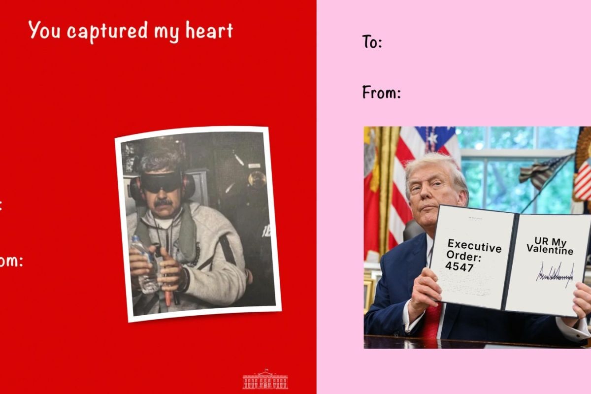 One card showed detained former Venezuelan President Nicolas Maduro blindfolded and wearing a grey tracksuit, framed in red colour.