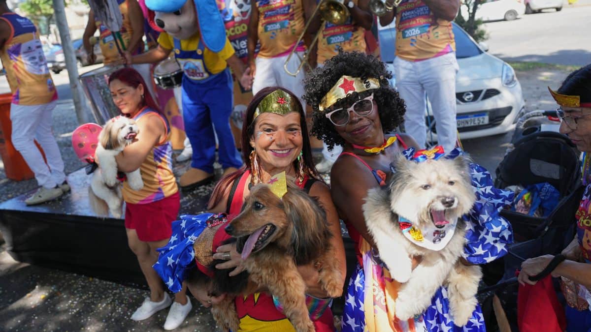 Around 300 people and their costumed dogs gathered at Rio de Janeiro’s annual ‘Blocao’ Carnival street party to protest against violence towards pets