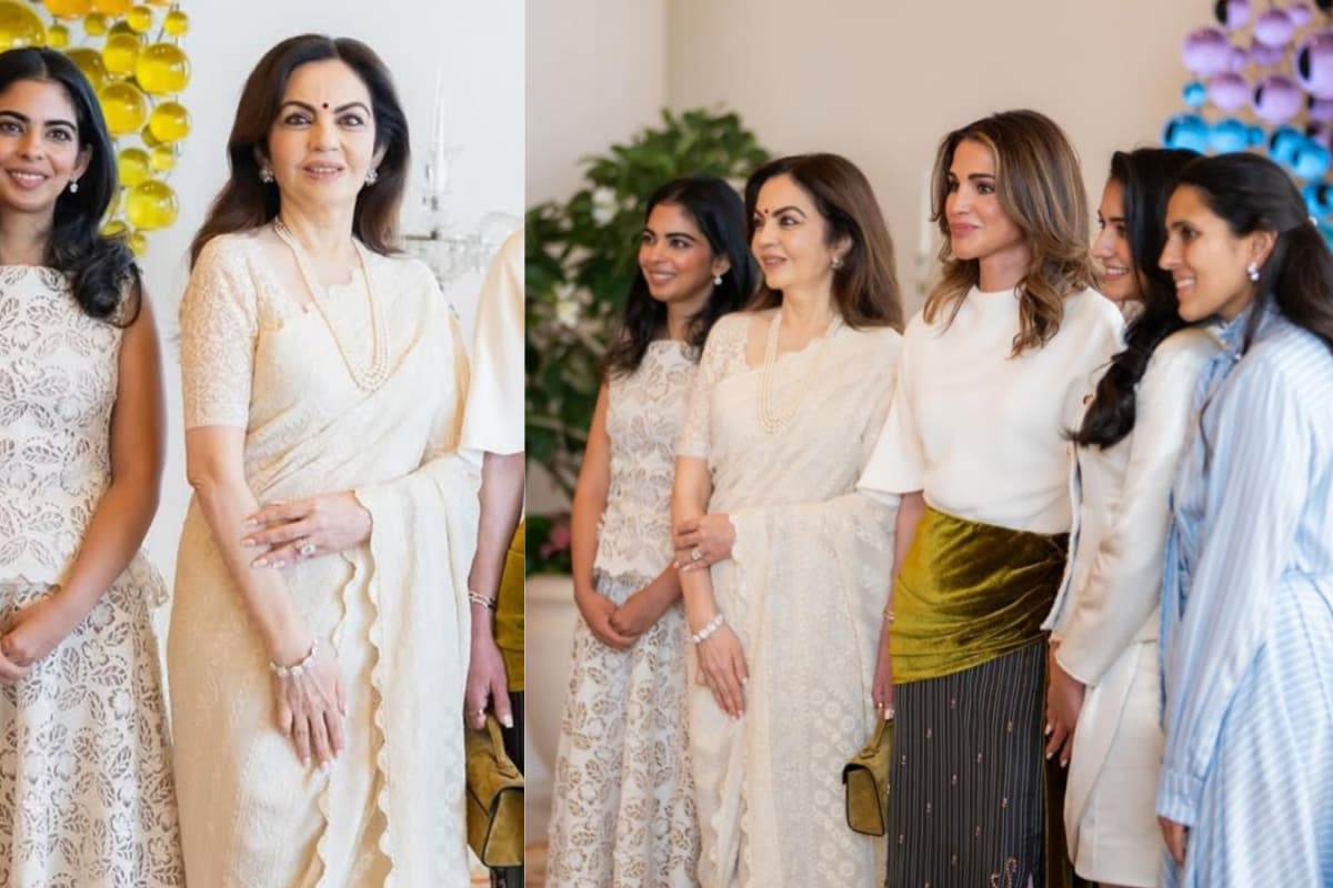 Isha Ambani hosts Queen Rania at NMACC wearing a Bibhu Mohapatra jasmine web lace top and pleated tulle skirt, a masterclass in modern elegance.