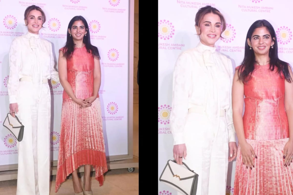 Isha Ambani makes a striking statement in a sculpted coral gown at the NMACC Roundtable with Queen Rania. Here’s a detailed breakdown of her standout look.