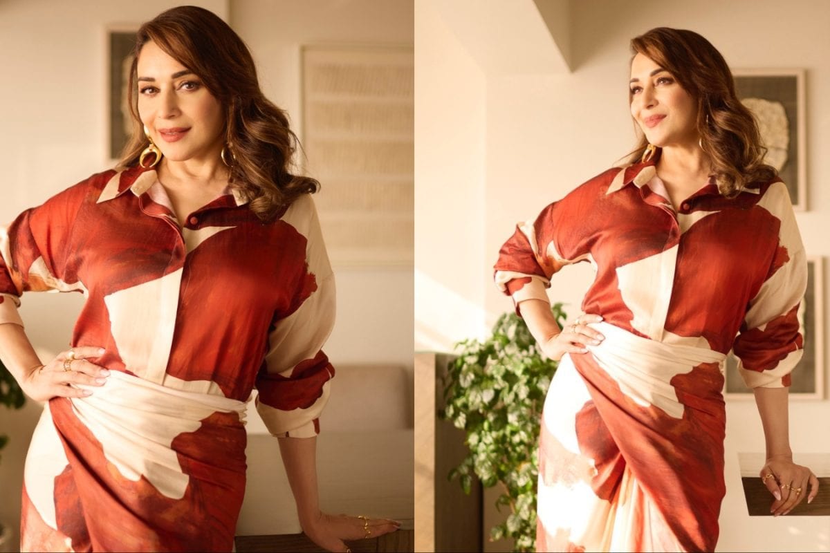 Madhuri Dixit steps out in a printed Nouria co-ord set that blends tailored shirting and fluid drapes, offering effortless day-to-night elegance.