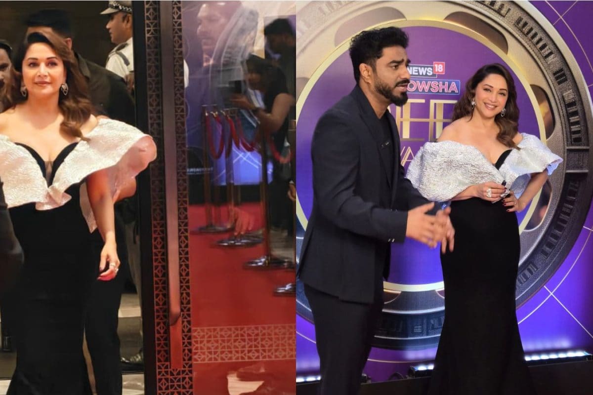 Madhuri Dixit Turns Heads In Sculptural Black Gown With Dramatic Silver Ruffle At News18 Showsha Reel Awards 2026