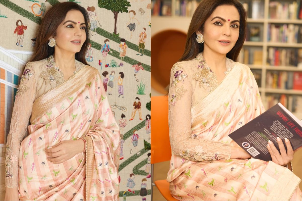 Nita Ambani’s Women’s Day look blends a Swadesh Banarasi saree with Anamika Khanna couture, celebrating Indian textiles and craftsmanship.