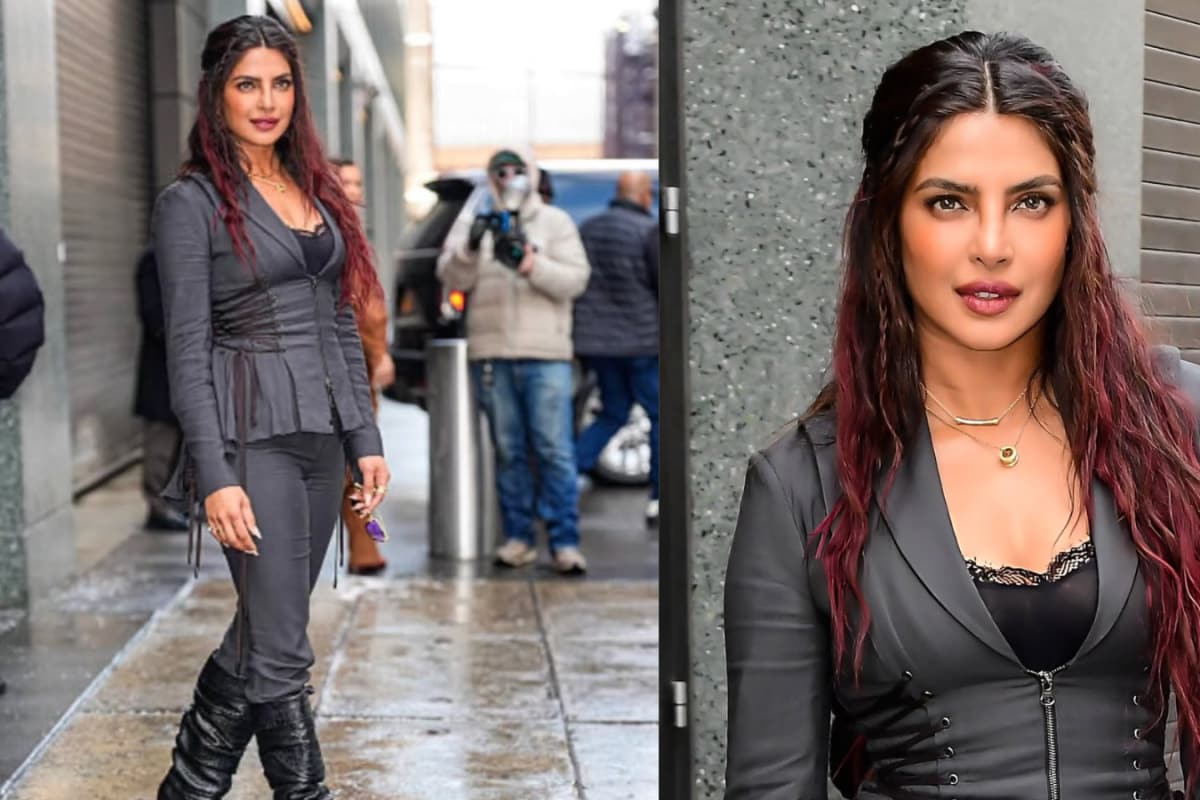 Priyanka Chopra stuns in a corset-style blazer, slim trousers and leather boots during The Bluff promotions, showcasing bold street-style glamour.
