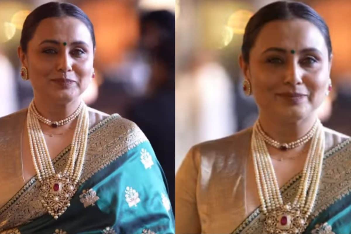 Rani Mukerji stuns at Eka Lakhani’s reception in a regal green silk saree paired with polki jewellery, a gajra adorned bun, and classic Bollywood glam.
