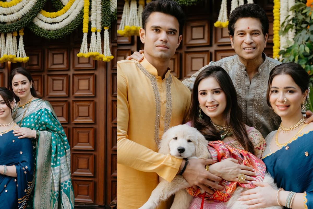 Sara Tendulkar stuns in a blue Maharashtrian saree with a classic nath and gold jewellery during Arjun Tendulkar and Saaniya Chandhok’s wedding festivities.