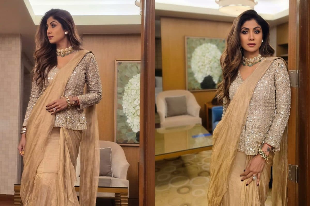 Actor Shilpa Shetty was recently in Indore for an event, and wore a gold tissue saree with an embroidered jacket.