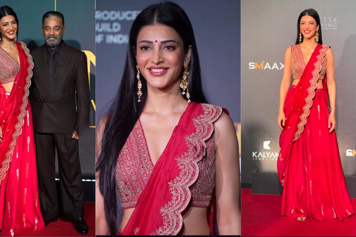 Shruti Haasan Slays In Crimson Cocktail Saree Bringing Modern Maharani Aura To The Red Carpet