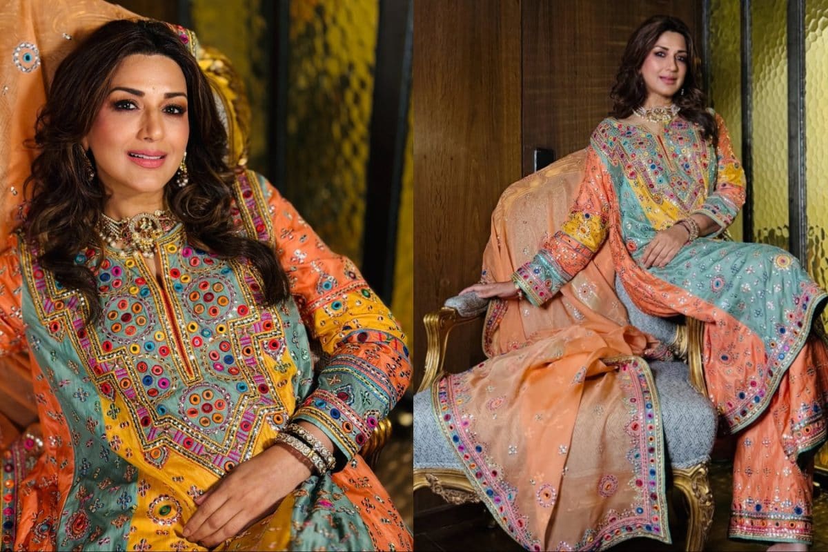Sonali Bendre’s colourful kurta set by Abu Jani Sandeep Khosla proves vibrant craft and breezy silhouettes can redefine reception-ready style.