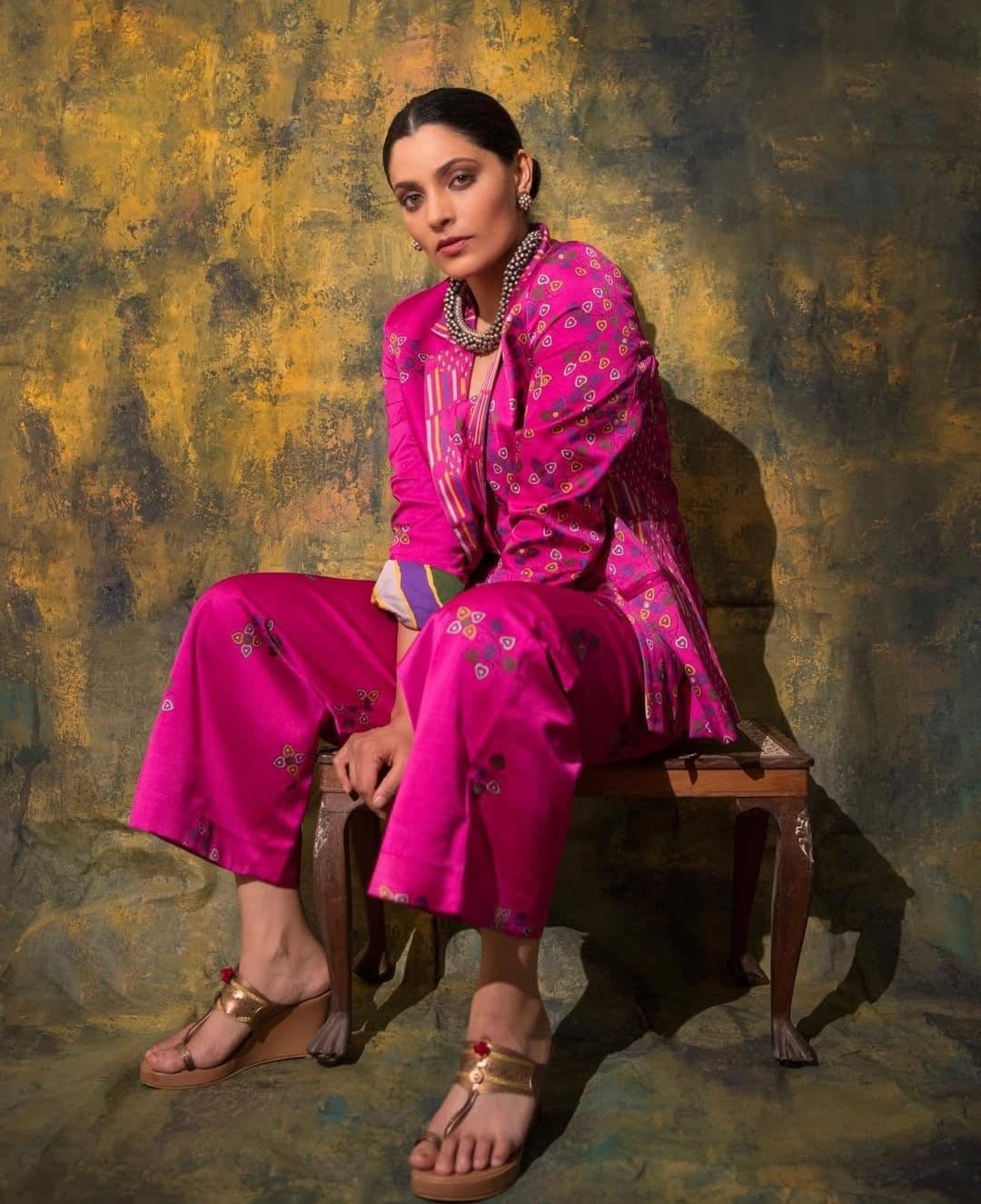 Saiyami Kher makes a strong fashion statement in a bold, bright pink pantsuit. The unique knotted detail on the blazer adds an avant-garde touch, while her metallic heels complete the sophisticated and edgy look. This ensemble is perfect for those who want to stand out with a modern, powerful, and vibrant style during the festivities.
