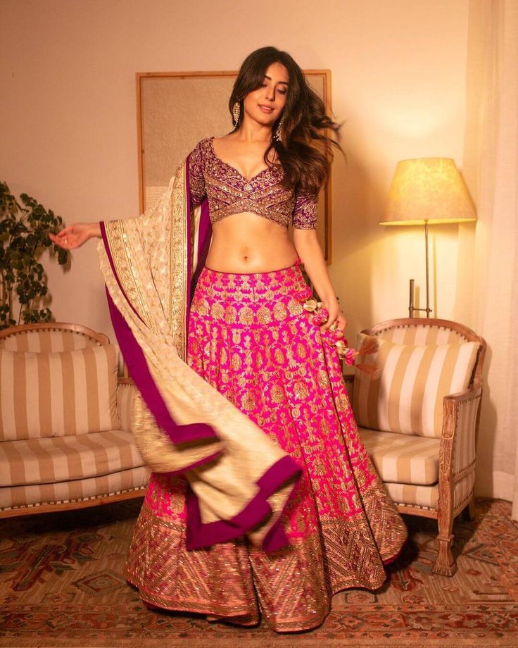 Kritika Kamra radiates glamour in a deep pink lehenga choli. The choli features intricate embellishments and a flattering V-neckline, while the lehenga skirt boasts rich embroidery and a beautiful flare. Her flowing dupatta and elegant styling make this a perfect choice for grand Navratri celebrations and dancing the night away.